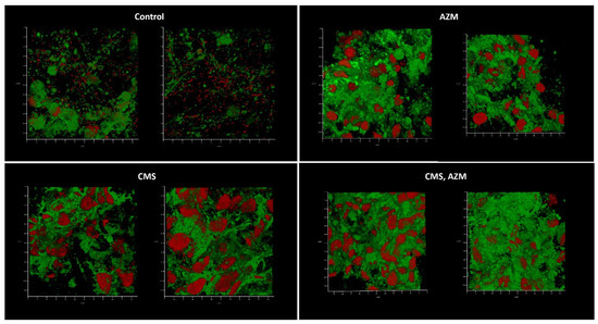 In vitro wound model of a K. pneumoniae UHI 1090 biofilm exposed to colistin methanesulfonate and azithromycin. Images were taken after 48 h of biofilm development on a 3D collagen scaffold seeded with the epithelial-like cell line HEK293, in medium No. 2 (89.9% DMEM/high glucose, 10% FBS, 0.01% Bacto Proteose Peptone), supplemented with 5 mg/L colistin methanesulfonate (CMS) or 10 mg/L of azithromycin (AZM), or both colistin methanesulfonate and azithromycin (CMS, AZM), or without (control). Confocal laser scanning microscopy imaging, 120 µm × 120 µm × 35 µm, 10 µm per division. AmyGreen was used to stain collagen (green signal) and ethidium bromide was used to stain eukaryotic nuclei and bacteria (red signal).