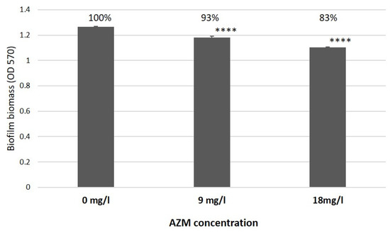 The effect of azithromycin on biofilm growth by K. pneumoniae UHI 1090 investigated using biofilm assays and optical density (OD) measurements at 570 nm after 24 h incubation (adapted from Figure 5 in [10]). Statistical differences were determined between media with azithromycin versus control media without; **** p < 0.001.