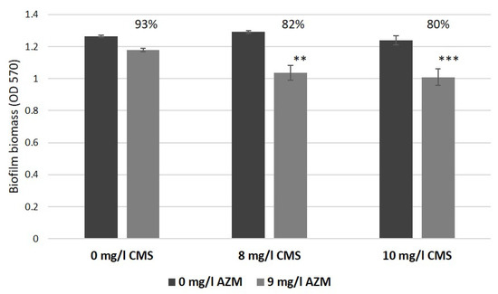 The effect of azithromycin and colistin methanesulfonate on biofilm growth by K. pneumoniae UHI 1090 investigated using biofilm assays and with optical density (OD 570) measurements after 24 h incubation (adapted from Figure 5 in [10]). Statistical differences were determined between media with azithromycin versus control media without; ** p < 0.01, *** p < 0.005.