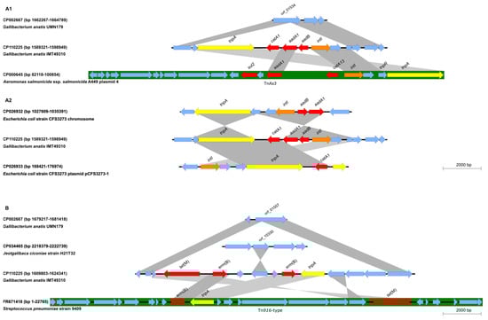 Organization of the resistance gene regions of G. anatis IMT49310. Open reading frames are shown as blue arrows, resistance genes are marked in red, transposase genes in yellow, and integrase genes in orange. The arrowheads indicate the direction of transcription. IS or integrative and conjugative elements and transposons are depicted as green boxes, and grey shading indicates similarities between sequences. (A1,A2) Schematic representation and alignment of resistance gene region I of G. anatis IMT49310 (CP110225) with sequences CP002667 (G. anatis UMN179), CP000645 (Aeromonas salmonicida ssp. salmonicida A449 plasmid 4), CP026932 (Escherichia coli strain CFS3273 chromosome) and CP026933 (E. coli strain CFS3273 plasmid pCFS3273-1) from GenBank. (B) Schematic representation and alignment of resistance gene region II of G. anatis IMT49310 (CP110225) with sequences CP002667 (G. anatis UMN179), CP034465 (Jeotgalibaca ciconiae strain H21T32 chromosome) and FR671418 (Streptococcus pneumoniae strain 9409 Tn916-type integrative and conjugative element) from Genbank. (C1,C2) Schematic representation and alignment of resistance gene region III of G. anatis IMT49310 (CP110225) with sequences CP002667 (G. anatis UMN179), CP029322 (Pasteurella multocida strain 14424), CP043925 (Proteus columbae strain T60 chromosome), and MW391932 (Haemophilus parainfluenzae strain HUB10329) from GenBank.