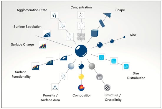 SDF discolouration is caused by oxidation of ionic silver to metallic silver and silver oxide, with subsequent precipitation of silver–protein and silver phosphate complexes on tooth structure. Given this issue, there is a need to find additional antimicrobial agents to augment or replace silver, reducing the need for high concentrations of ionic silver. Any such replacements should reduce the tendency to darken carious lesions. Nanomaterial-based antimicrobial agents have become more widely used for a range of medical applications. Nanoparticles have distinctive characteristics such as a large surface area and enhanced reactivity []. In dentistry, nanoparticles have been loaded into various dental materials to provide antibacterial actions []. The antimicrobial potential of metallic nanoparticles can be controlled by altering various physio-chemical parameters, such as particle size, shape, and zeta potential, and by altering the method of synthesis or by applying capping agents []. Each physio-chemical property is potentially important when evaluating the biological behaviour and impacts of nanoparticles. For instance, nano morphology plays an important role in the fate and performance of nanoparticles. Different nanoparticle shapes give different diffusion rates. A further point is that shape affects steric hindrance when nanoparticles collide with and interact intimately with surfaces []. An additional example of nanoscale parameters influencing behaviour is agglomeration, where many nanoparticles come together into clusters due to attraction forces. Agglomerations cause large clusters to form; these have a smaller surface area and so are not as biologically active as separate individual nanoparticles. A range of important nano specifications are illustrated in Figure 1.