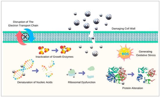 Several modes of action of silver explain its antibacterial actions. Firstly, it attacks bacterial cell walls and changes their permeability, which leads to the leakage of cellular contents and impaired transport activity across the membrane []. Silver also generates reactive oxygen species (ROS) and hydroxyl radicals, which damage microbial DNA and cause lipid destruction through oxidation []. Ionic silver also inhibits the proton motive force, leading to apoptosis []. Moreover, AgNPs deactivate respiratory chain dehydrogenases, which inhibits cell respiration and growth. Once combined with halides, AgNPs release silver ions and produce more ROS []. A recent study by Hovhannisyan and colleagues pointed out that the effect of green synthesised AgNPs on bacterial membrane permeability was due to effects on formate hydrogenlyase proton–potassium transporters, energy-dependent H+-fluxes, and H+-translocating ATPase activity []. In addition, by specifically disturbing FOF1-ATPase activity, these biogenic AgNPs can affect bacteria that have no respiratory chain such as the Enterococcaceae species. The antimicrobial mechanisms of action of AgNPs are demonstrated in Figure 2.