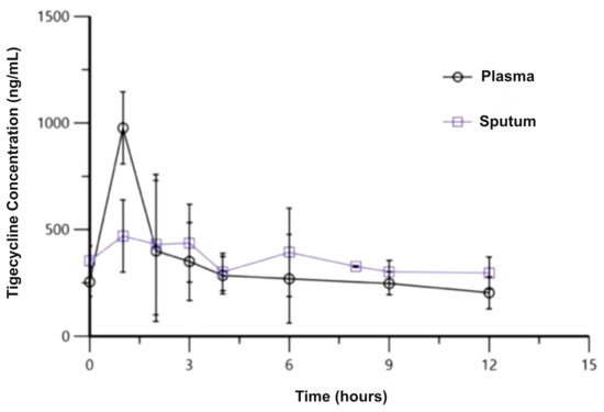 A loading dose of 100 mg tigecycline (dose 1) was administered intravenously (i.v.) to all patients followed by 50 mg tigecycline i.v. every 12 h. Every tigecycline infusion duration was 1 h. Blood and sputum samples were collected at steady state after tigecycline dose 7 (on day 4 or 5 of hospitalization). For this purpose, blood samples were collected through a peripheral catheter positioned remotely from the catheter used for the treatment infusion on specific time points, i.e., just before the infusion of tigecycline and 12 h from the previous dose (time 0), on completion of the 1-h tigecycline infusion (time 1), and then 2, 3, 4, 6, 9, and 12 h after the i.v. administration. Blood samples were centrifuged, and the supernatant plasma was stored at −20 °C.