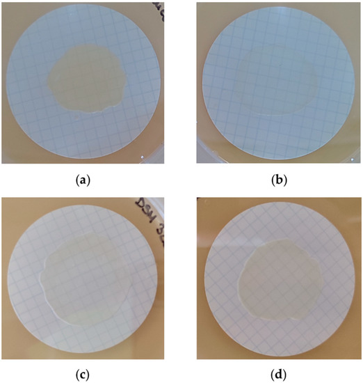 Biofilm formation on ø 47 mm membranes placed on BHI agar plates with 1% glucose: (a) S. aureus OBV 17/166; (b) S. aureus ATCC 25923; (c) S. epidermidis DSM 3269; (d) S. lugdunensis OBV 20/143.