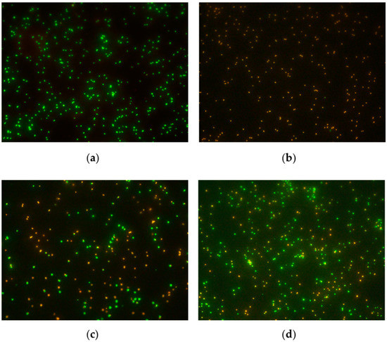 Examples of viable (green) and dead (red) bacteria (S. epidermidis DSM 3269) visualized using fluorescence microscopy: (a) suspension of live bacteria; (b) suspension of dead bacteria; (c) suspension of induced VBNC bacteria by gentamycin at 4 × MIC; (d) suspension of induced VBNC bacteria by gentamycin at 16 × MIC. Magnification, 600×.