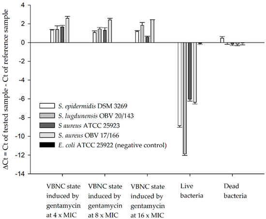 Suspensions of VBNC, live, and dead bacterial cells were adjusted to OD670nm of 0.6 diluting samples with the sterile 0.85% NaCl solution. A 100 µL of bacterial dilutions was then combined with BHI and bacteriophage K in a total volume of 1 mL. The final bacteriophage K concentration was 1.8 × 104 PFU/mL. A reference control sample was assessed and consisted of BHI with phage K at the same concentration. As a negative control, live and dead E. coli ATCC 25922 suspensions were used. Samples were incubated at 37 °C with shaking for 180 min. After that, 30 µL of chloroform (Sigma-Aldrich, St. Louis, MO) was added to each sample and vortexed for 2 min. Afterward, samples were centrifuged in a tabletop MiniSpin centrifuge (Eppendorf AG, Hamburg, Germany) at 3287× g for 5 min, and 1 µL of each supernatant was assayed in the qPCR in triplicates.
