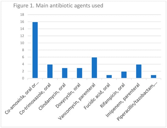 After treatment (including at least one surgical debridement in all, and partial amputation in 596 [58%], antibiotic therapy [45 different regimens (Figure 1) with a median duration of 20 days, of which 5 days were administered parenterally], hyperbaric oxygen therapy (98 cases [10%]), 251 (25%) of the episodes met our definition of clinical failure. Of these, 119 cases (12%) met our definition of microbiological recurrence. The follow-up duration for these episodes was a minimum of six months, and a median of 3.3 years. The six main antibiotic agents used for skin commensals were co-amoxiclav (40%; practically for all susceptible commensals), vancomycin (15%), co-trimoxazole (10%), clindamycin (8%), doxycyclin (8%), and fusidic acid with rifampicin (8%). Hence, 34% were treated with co-trimoxazole, doxycycline, or rifampicin plus fusidic acid because that was the best choice based on the antibiogram. Linezolid and daptomycin were very rarely used, and only for a short period.