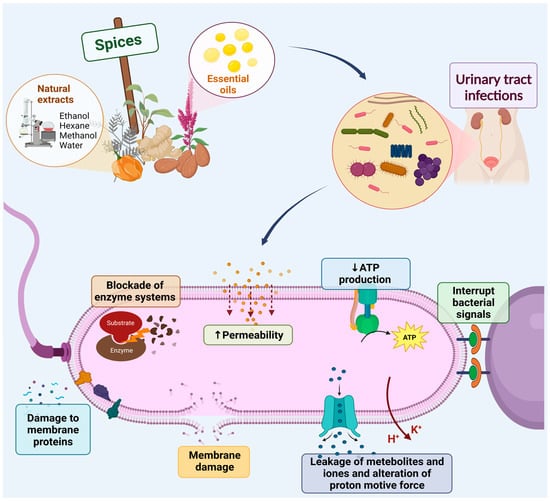 Urinary tract infections (UTIs) are the most common infectious diseases worldwide. These infections are common in all people; however, they are more prevalent in women than in men. The main microorganism that causes 80–90% of UTIs is Escherichia coli. However, other bacteria such as Staphylococcus aureus, Enterococcus faecalis, Pseudomonas aeruginosa, Proteus mirabilis, and Klebsiella pneumoniae cause UTIs, and antibiotics are required to treat them. However, UTI treatment can be complicated by antibiotic resistance and biofilm formation. Therefore, medicinal plants, such as spices generally added to foods, can be a therapeutic alternative due to the variety of phytochemicals such as polyphenols, saponins, alkaloids, and terpenes present in their extracts that exert antimicrobial activity. Essential oils extracted from spices have been used to demonstrate their antimicrobial efficacy against strains of pathogens isolated from UTI patients and their synergistic effect with antibiotics. This article summarizes relevant findings on the antimicrobial activity of cinnamon, clove, cumin, oregano, pepper, and rosemary, spices popularly used in Mexico against the uropathogens responsible for UTIs.