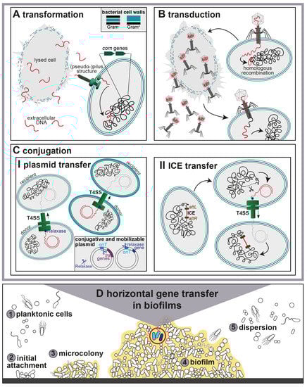 HGT research originated in the late 1920s. When DNA was determined to be the source for transfer, the repertoire of methods to examine gene transfer expanded. HGT occurs within the same species, but also crosses phylogenetic barriers thereby setting no limits to acquiring resistance from phylogenetically unrelated bacteria from diverse environmental habitats [,]. The driving factors of HGT are mobile genetic elements (MGEs) such as plasmids, ICEs, integrons, or transposons [,,,]. As most bacteria live in biofilms in nature, it seems reasonable that HGT occurs more frequently in biofilms than between planktonic cells [,].
