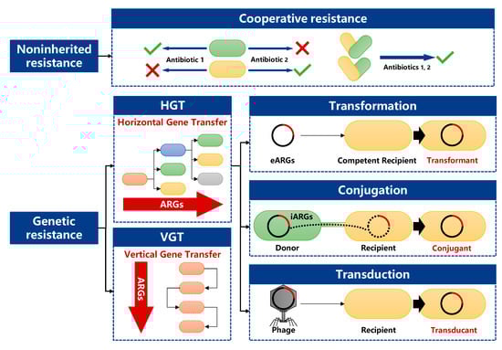 The causes, inheritance, and transmission mechanisms of antibiotic resistance are very complex and can be divided into genetic resistance and non-inherited resistance [39] (Figure 1). Non-inherited resistance refers to resistance that is not acquired through horizontal or vertical transfer of ARGs but through behaviors such as collaboration between groups [40]. Cooperative resistance, a population-based survival strategy that adapts to high antibiotic stress through the cooperation of multiple ARBs, is a typical non-inherited resistance [41]. Cooperative resistance widely occurs in infections of the upper respiratory tract, skin, and soft tissue, resulting in many cases of antibiotic treatment failures and polymicrobial infections, which have attracted a lot of attention in clinical studies [42]. However, cooperative resistance in the natural environment has not received enough attention, so we summarized and discussed the spread of antibiotic resistance from the perspective of genetic resistance.
