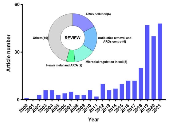 Different soil types and soil components could cause significant differences in the occurrence and propagation of ARGs in soil. Some researchers have found that the influence of human activities on the occurrence of ARGs in soil is related to soil type [5,6], and the influence of soil type and related properties is even greater than that of human activities themselves [7,8,9], while others have achieved the control of ARGs in soil by the exogenous addition of soil components such as biochar [10] and natural zeolite [11]. Studies from the micro perspectives discussed the influence of soil components on the horizontal gene transfer process of ARGs including transformation [12] and conjugation [13] in pure bacteria systems based on the pure culture of bacteria. Relevant studies have been carried out from the above perspectives, so we could deepen our understanding of soil types and soil components affecting the occurrence and spread of ARGs and lay a foundation for future research by collating and reviewing these contents.