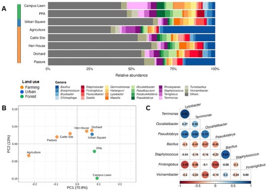 Most abundant taxa and their distributions throughout the study sites at genera level. (A) Relative abundances of groups found in environmental samples according to 16S sequencing. All taxa found with relative abundances below 2.5% in each sample were labeled as “Others”. (B) Principal component analysis (PCA) of most abundant bacteria, clustered together per sampling site and colored according to land-use classification. (C) Correlogram indicating negative (in red) and positive (in blue) correlations among most abundant taxa (minimum relative abundance of 5%) in the studied sites.