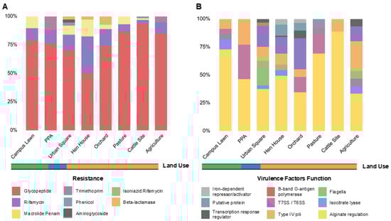 Relative abundances of ARGs and VFs per soil metagenome. (A) Relative abundances of the identified ARGs per soil metagenome, colored by resistance category, as indicated in the legend. (B) Relative abundances of the identified VFs per soil metagenome, colored by function, as indicated in the legend. The ARGs were identified by CARD and VFs by VFDB, and the abundances were estimated by dividing the number of distinct resistance genes in the category (i.e., ARG potential resistance or VF function) by the total number of genes for all classes found in that site. Land use is indicated in orange (farming), blue (urban) and green (forest).