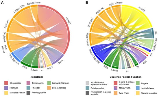 Identified gene distributions across sequenced soil samples. (A) Chord diagram showing the distribution of different ARGs per soil metagenome. Resistance genes are colored by resistance category and soil sites are colored by land-use system as follows: orange—farming; blue—urban; green—forest. (B) Chord diagram showing the distribution of different VFs per soil metagenome. Virulence-related genes are colored by function, as indicated in the legend. (acpXL, alg, mucD) Acyl carrier proteins; (icl) isocitrate lyase; (hsiB1/vipA) type VI secretion system, T6SS; (flg, fli, cheW) Flagella; (pil) type IV pili; (esx) type VII secretion system, T7SS; (waaG) B-band O-antigen polymerase; (phoP) possible two-component system response transcriptional positive regulator; (mbtH) putative protein; (ideR) iron-dependent repressor and activator. * (vanSO, efpA, aac2-lb, cpt, bla, dfrB); ** (ideR, mbtH, phoP, mucD, waaG); *** (flgC, alg, icl). Resource: https://public.flourish.studio/visualisation/116771 & https://public.flourish.studio/visualisation/116970. Accessed on 22 November 2022.