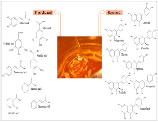 Most common phenolic compounds identified in honey. Adapted from Cianciosi et al. (2018) [67].