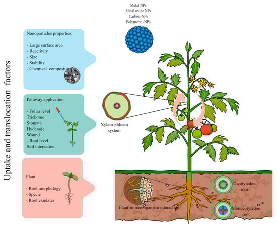 - Khan, I.; Afzal Awan, S.; Rizwan, M.; Hassan, Z.U.; Adnan Akram, M.; Tariq, R.; Brestic, M.; Xie, W. Nanoparticle’s uptake and translocation mechanisms in plants via seed priming, foliar treatment, and root exposure: A review. Environ. Sci. Pollut. Res. 2022, 29, 89823–89833. [Google Scholar] [CrossRef]