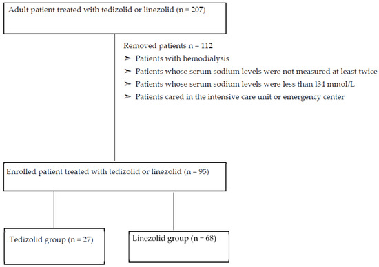 Linezolid (LZD) is a first oxazolidinone antibiotic for meticillin-resistant Staphylococcus aureus (MRSA). Owing to high tissue penetration and almost 100% bioavailability, oral drugs can be expected to have the equivalent antibacterial activity as injection drugs. [1,2]. Tedizolid (TZD) is next oxazolidinone antibiotic approved after LZD. TZD has good tissue transferability and is used for skin, soft tissue, and osteoarticular infections [3,4]. In such conditions, long-term use may be necessary, which might lead to an increased risk of adverse events. Thrombocytopenia is a major side effect with LZD. Though in previous study reported that rates of thrombocytopenia were found to be lower with TZD than with LZD [5]. In addition to thrombocytopenia, the side effect of hyponatremia with LZD has also been reported [6,7]. Hyponatremia is the major electrolyte abnormality seen in the clinical setting. Severe hyponatremia is associated with increased mortality and morbidity and longer hospital stays [8,9]. Tedizolid is a drug that is expected to have improved safety compared to linezolid, especially with myelotoxicity and drug interactions [10,11,12]. However, Studies regarding the adverse effects of TZD in Japanese patients are scarce [13]. Comparing the incidence of hyponatremia between LZD and TZD is considered important to ensure patient safety in treating MRSA. Therefore, we conducted a comparative retrospective study to assess hyponatremia associated with LZD and TZD.