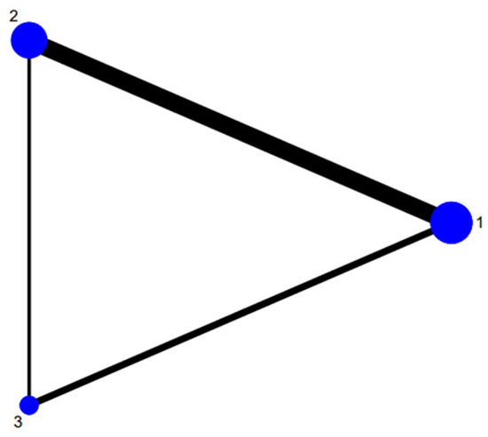 Network of included studies with available direct comparisons. 1. Vonoprazan-amoxicillin; 2. vonoprazan-amoxicillin-clarithromycin; 3. PPI-amoxicillin-clarithromycin.