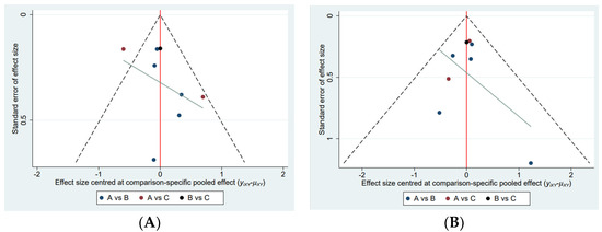 Comparison−adjusted funnel plot. (A) Adverse events, (B) Efficacy A, Vonoprazan dual therapy; B, vonoprazan triple therapy; C, PPI triple therapy.