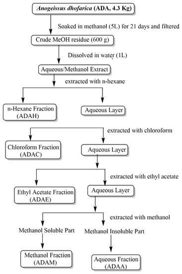 Methanol (ADAM) extract and different fractions (ADAH, ADAE, ADAC, and ADAA) of A. dhofarica were subjected to qualitative analysis via standard techniques to evidence the presence of various groups of compounds such as flavonoids, carbohydrates, alkaloids, and phenols [28,29,30,31].