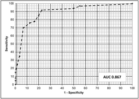 After the completion of the ANN learning and prediction processes, our neural network showed a sensitivity of 87.8% and specificity of 97.3% in predicting the clinical efficacy of empirical therapy. The area under the ROC curve was 0.867 (Figure 1). The calibration plot of predicted probabilities compared with actual probabilities is displayed in Figure 2. ANN analysis reported a high correlation between expected and observed data (train phase: Pearson’s coefficient, 81.5—Root Mean Square error, 1.3; test phase: Pearson’s coefficient, 79.7—Root Mean Square error, 1.2). Moreover, the ANN analysis shows a prediction with an overall accuracy of 83.63%, and the previous use of fluoroquinolones and cephalosporins in the last three months as well as the presence of E. coli with resistance against cotrimoxazole to be the most influential variables affecting the fluoroquinolone-based therapy failure. The presence of Escherichia coli with resistance to fosfomycin and amoxicillin-clavulanic acid has not been confirmed to be an influential variable affecting the output decision in predicting the cephalosporins and cotrimoxazole-based therapy failure in the ANN analysis. Finally, the previously mentioned Escherichia coli with resistance against cotrimoxazole (yes, HR = 2.35, p < 0.001) and resistance against amoxicillin-clavulanic acid (yes, HR = 3.41, p = 0.007) have been identified as the most important variables affecting the ANN output decision predicting the fosfomycin-based therapy failure.