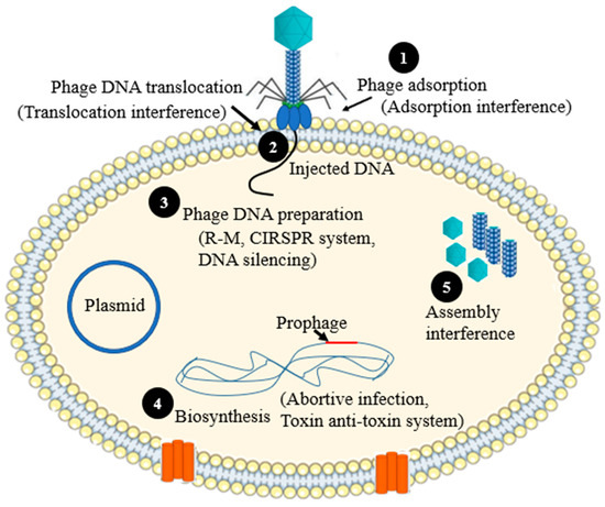 The mechanism of phage resistance could take place at various stages of phage replicative cycle. During the phage replication cycle, a phage introduces its DNA via translocation into the host’s cytoplasm. This will lead to either the lysogenic cycle (prophage formation) or the lytic cycle. In the lytic cycle, phages pass via several steps and early and late gene expression, which leads to maturation and aggregation of newly produced virion, which are ultimately released via lysis. The phage resistance strategies can interfere with one of these steps as shows in Figure 1 [8], and each resistance mechanism is described in detail below.