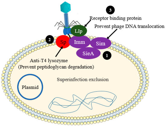 Schematic illustration of the superinfection exclusion systems. (1) Phage proteins prevent phage DNA translocation—Imm (T4 phage), SieA (P22 phage), Sim (P1 phage). (2) Prevent phage peptidoglycan layer degradation by inhibiting T4 lysozyme activity (Sp of T4 phage). (3) Phage protein bind to the receptor (e.g., LIp prevents the entry of T5 phage).