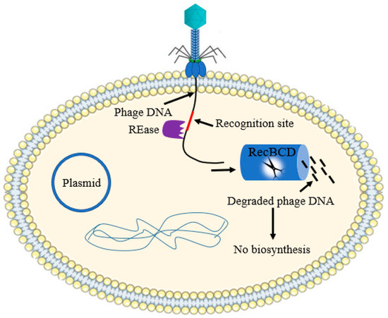 Bacterial cell typically used a restriction endonuclease (REase) enzyme, which cleaves the phage DNA at specific recognition site(s). In response to this defense feature, phages developed a broad range of passive and active anti-restriction strategies [22,64] (Figure 10).