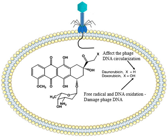 Antiphage defense systems discussed so far have largely been mediated by RNA or proteins complexes acting on individual cells. However, bacterial secondary metabolites, such as gibberellins, toxins, alkaloids, and biopolymers, can interfere with the replication cycle of phages via different mechanisms and defending them from phage attack [59]. Maxwell and coworkers introduced a chemical anti-phage defense mechanism that predominantly occurred in soil fungus, Streptomyces spp. They reported that Streptomyces spp. synthesized two vital bioactive metabolites (doxorubicin and daunorubicin) that bind (intercalate) into the DNA of phage and prevent the replication cycle. Interestingly, the bacterial growth pattern was not affected by these molecules. It has been proposed that daunorubicin exerted its action at an early stage in the phage replication cycle, after the translocation of the DNA, but ahead of replication. Doxorubicin forms free radicals (e.g., OH•), which can damage DNA and cause DNA oxidation (Figure 8). The authors also reported that these metabolites can disperse into bacteria cells and safeguard them from infection [60]. Idarubicin and pirubicin are other DNA intercalating agents, which are produced by Streptomyces spp. These metabolites are thought to affect the circularization process of the phage linear DNA or to affect proteins that are involved in the transcription and translation process [59,61].