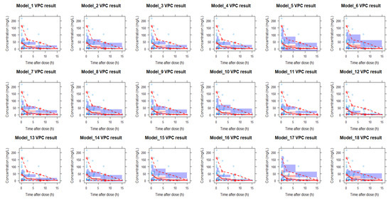 Visual predictive checks (VPCs) were used to visually evaluate the fit of the individual models. The VPC results of the eighteen models are shown in Figure 1. The concentration range observed in our clinical data was larger than expected from the model. All models showed an under prediction of the variability. Median peak concentrations (time after infusion 0–1 h) were underestimated in ten models (model 1, 2, 4, 8, 10, 11, 12, 13, 14, 18), where model 12 and 14 performed the worst. In contrast, three models (models 7, 9 and 17) slightly overestimated the median peak concentration. The fit of the median trough concentrations was better than that of the peak concentration, with six models (models 2, 11, 12, 13, 14, 16) underestimating the trough concentrations and one model (model 7) overestimating the trough concentration. For the median concentrations between the peak and trough period (time after infusion 1–6 h), five models (model 3, 7, 9, 17, 18) overestimated the observed concentrations and 1 model (model 12) underestimated the observed concentrations. Overall, models 5, 6 and 15 outperformed the other models based on the VPC fit results for median concentrations. However, these models have relatively wide 95% confidence intervals (shaded area) with respect to the other models.