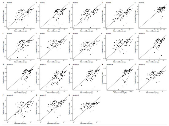 The goodness-of-fit plots of the 18 models. Population predictive concentration (y-axis) versus observed concentration (x-axis).