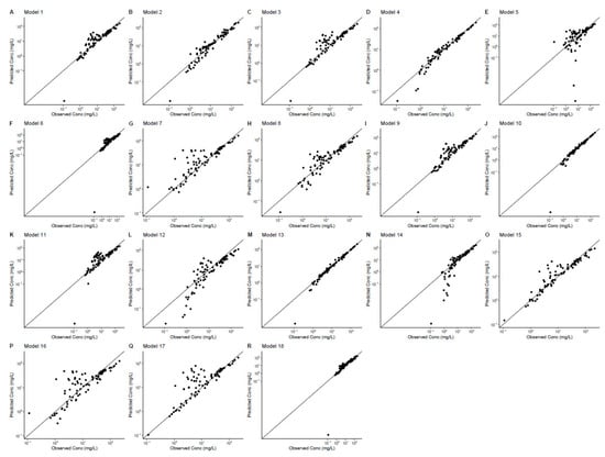 Individual predictive goodness-of-fit plots for eighteen models. Individual-predicted concentrations (y-axis) versus observed concentrations.