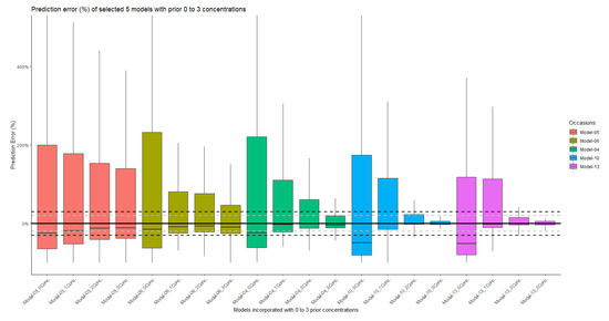 Prediction errors of model 5, 6, 4, 10 and 13. For each model, none, one, two or three plasma concentrations were used to improve the model fit. The grey dashed line is the y = ±20%. The black dashed line is the y = ±30%.