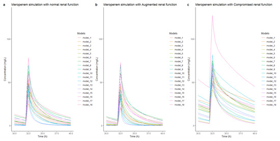 To evaluate the differences in the pharmacokinetic profiles of the models, simulations were performed with each model for three standard patients with different renal functions (normal renal function, enhanced renal function, and impaired renal function). The results of the simulations of steady-state concentrations (30–40 h after dose) are shown in Figure 5. In patients with normal renal function (Figure 5a), the simulated steady-state peak meropenem concentrations ranged from 25 to 78 mg/L, while the measured steady-state trough concentrations ranged from 0.07 to 9 mg/L. For the simulation of patients with enhanced renal function (Figure 5b), all but three models (model 5, model 9 and model 16) showed lower concentrations compared to the patients with normal renal function, with steady trough concentration ranges from 0.003 to 7.1 mg/L. For simulations in patients with impaired renal function (Figure 5c), drug concentrations were higher in patients with impaired renal function than in patients with normal renal function, with peak concentrations ranging from 42–127 mg/L and trough concentrations ranging from 2.4–45 mg/L.
