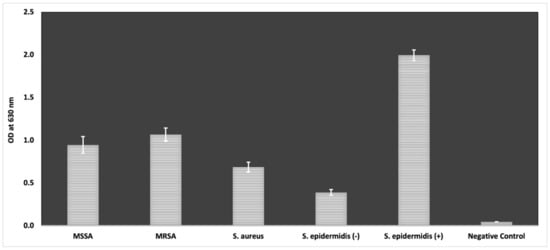 Comparison of biofilm formation ability of MSSA, MRSA, S. aureus ATCC 29213 (S. aureus), S. epidermidis ATCC 12228 (S. epidermidis (-)), and S. epidermidis ATCC 35984 (S. epidermidis (+)) regarding their OD values with negative control (TSBG medium only). Each value represents the mean of triplicate experiments with standard deviations (Tukey, p ≤ 0.05).