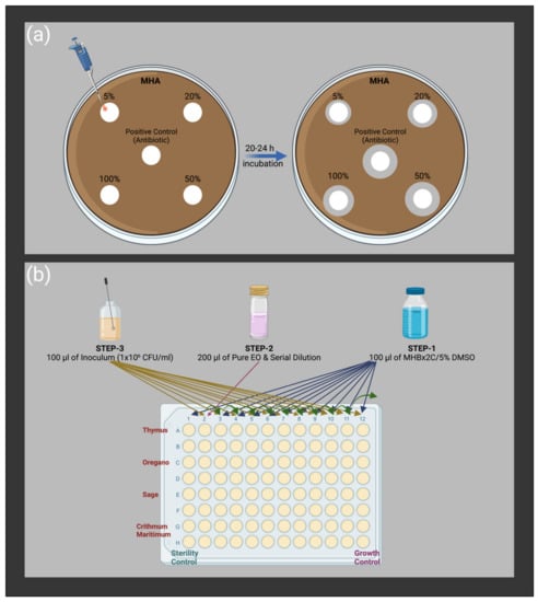 There has been a remarkable interest in EOs as alternative antimicrobial agents to overcome microbial resistance issues in both humans and animals [37,38,39,40], which directly threaten public health [41]. Thus, the scientific community has shown substantial interest in antimicrobial activity screening methods [42]. The antimicrobial activity of EOs is examined by a variety of bioassays, such as Kirby–Bauer disc diffusion, agar well diffusion, bioautographic, agar dilution, and broth macro- and micro-dilution methods.