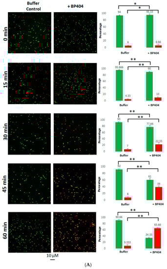 In order to confirm the antibacterial activity of protein BP404 against E. faecalis strains, a live/dead staining was performed after the addition of 15,000 ng of BP404 to 1 × 107 CFU of bacteria. The ratio of live/dead bacteria was observed with confocal microscopy. As observed earlier, the BP404 was able to significantly reduce the E. faecalis clinical isolate. As seen in Figure 6A, in the buffer control treated samples, the live to dead ratio of cells was 9:1 after 60 min after treatment. In contrast, BP404 treated E. faecalis clinical isolate live to dead cell ratio was 0.5:1.9, which translates to only 34.33% live cells (in green) and 65.66% dead cells (in red). At 15 min after addition of the protein, only 10% of the cells were dead. This number increased to 23.33% and 39% at the end of 30 min and 45 min, respectively.