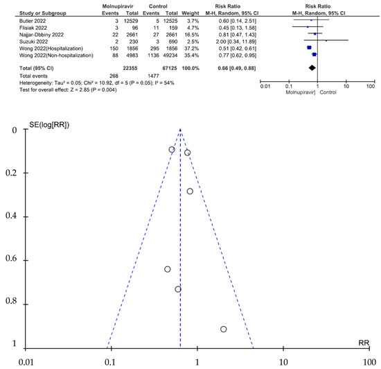 Six studies involving 89,480 patients (22,355 who received molnupiravir therapy, 67,125 who received placebo therapy) reported all-cause mortality [26,27,28,29,30,31]. All-cause mortality was significantly different between molnupiravir-treated and placebo-treated patients (RR = 0.66, 95% CI = 0.49–0.88, p = 0.004, I2 = 54%) (Figure 3).