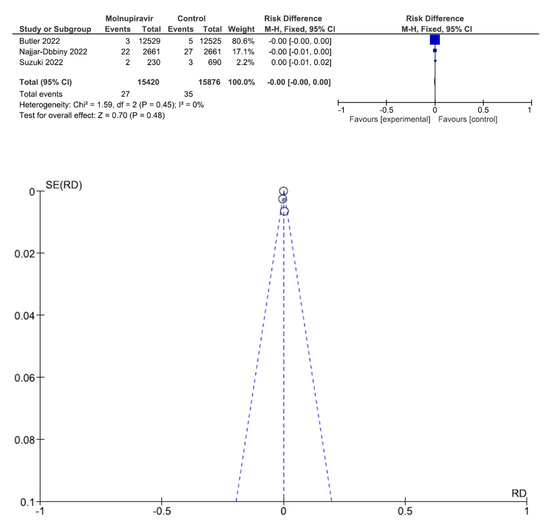 Three studies involving 31,296 patients with high COVID-19 vaccination coverage (15,420 who received molnupiravir therapy, 15,876 who received placebo therapy) reported all-cause mortality [26,28,29]. All-cause mortality was not significantly different between molnupiravir-treated and placebo-treated patients (RR = 0, 95% CI = 0.00–0.00, p = 0.48, I2 = 0%) (Figure 4).