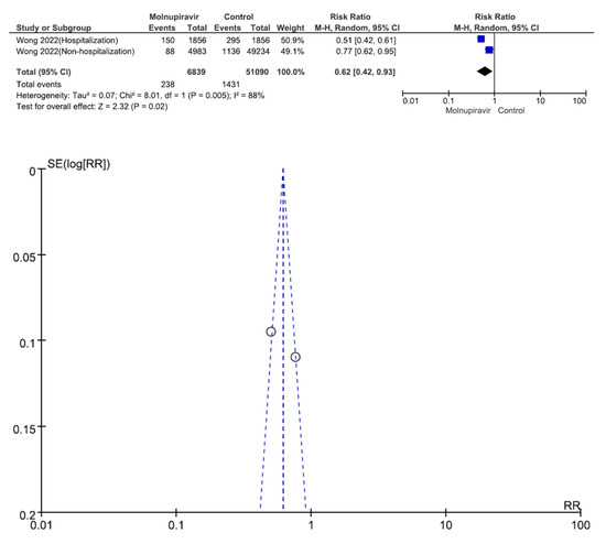 Two studies involving 57,929 patients with low COVID-19 vaccination coverage (6839 who received molnupiravir therapy, 51,090 who received placebo therapy) reported all-cause mortality [30,31]. All-cause mortality was significantly different between molnupiravir-treated and placebo-treated patients (RR = 0.62, 95% CI = 0.42–0.93, p = 0.02, I2 = 88%) (Figure 5).