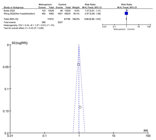 Two studies involving 79,271 patients (17,512 who received molnupiravir therapy, 61,759 who received placebo therapy) reported hospitalization [26,31]. Hospitalization was not significantly different between molnupiravir-treated and placebo-treated patients (RR = 0.98, 95% CI = 0.90–1.07, p = 0.66, I2 = 0%) (Figure 7).