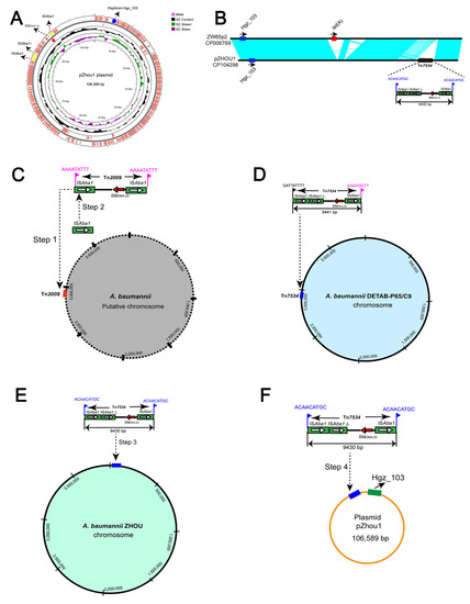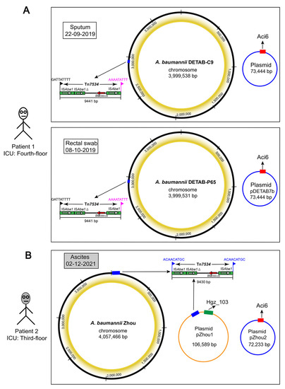 - Hua, X.; Xu, Q.; Zhou, Z.; Ji, S.; Yu, Y. Relocation of Tn2009 and characterization of an ABGRI3-2 from re-sequenced genome sequence of Acinetobacter baumannii MDR-ZJ06. J. Antimicrob. Chemother. 2019, 74, 1153–1155. [Google Scholar] [CrossRef]