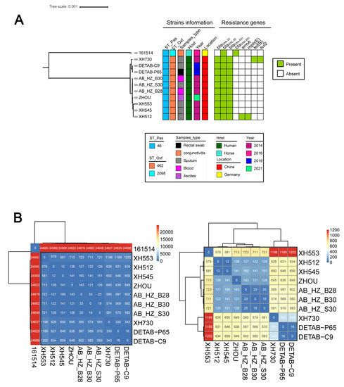 Phylogenetic analysis of 11 ST46Pas A. baumannii strains and SNPs matrix values among ST46Pas strains. (A) The tree was built with Snippy v4.4.5 and FastTree using RAxML under the GTRGAMMA model with DETAB-C9 as the reference strain and visualized with iTOL v5. Isolate name, Pasteur and Oxford MLST schemes, sample type, host, collection locations, isolation date and the heatmap of resistance genes are shown for each strain. The GenBank accession numbers of other ST46Pas A. baumannii strains from the NCBI GenBank public database are as follows: 161514 (GenBank accession number: RPDK01000001), XH730 (GenBank accession number: LYHV01000001), AB_HZ_B30 (GenBank accession number: PRIR01000001), AB_HZ_S30 (GenBank accession number: PRFV01000001), AB_HZ_B28 (GenBank accession number: PRJO01000001), XH553 (GenBank accession number: LYKU01000001), XH545 (GenBank accession number: LYLC01000001), XH512 (GenBank accession number: LYLG01000001). (B) SNP matrix values among ST46Pas strains. SNP differences are indicated as numbers in the boxes. Strains in the black square are the same.