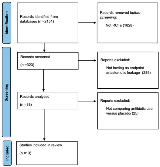 A total of 2151 studies were found in the electronic search. After reviewing titles and abstracts, 1828 studies were excluded, while 323 were screened. Out of these, 285 did not have anastomotic leakage as an endpoint. No eligible trials were found prior to 1973, and the first trial included in the meta-analysis was from 1977. The remaining 38 articles were analyzed and 25 were excluded because they did not compare antibiotic use with a placebo control group. Thus, 13 articles were included in the final analysis (Figure 1).