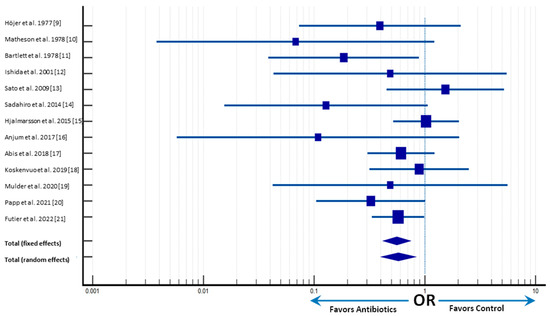 In fact, the use of antibiotic prophylaxis is still not broadly regarded as a standard of care, despite research released in 1981 that already demonstrated its value in reducing infection rates and overall mortality, as well as establishing the need for no more placebo or control trials [22]. A Cochrane Review that showed a substantial decrease in surgical site infections in patients receiving parenteral antibiotic prophylaxis compared to those receiving no antibiotics or a placebo (RR 0.34, 95% CI 0.28–0.41, p = 0.0001) presented conclusive evidence in favor of this claim [23].