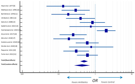 The individual and pooled odds ratio (OR) and risk differences of ALs are shown in Figure 4. The overall analyses indicated that patients randomly assigned to the antibiotic prophylaxis, regardless of the regimen or route of administration, had reduced risk of ALs (p = 0.003), compared with participants receiving MBP alone. Indeed, the meta-analysis average effect, represented by the center of the diamond, is located at the left of the vertical line center for both endpoints, favoring intervention (Figure 4).