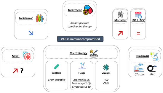 Main characteristics of ventilator-associated pneumonia in immunocompromised patients. BAL: broncho-alveolar lavage; LMV: length of mechanical ventilation; LOS: length of stay; MDR: multidrug resistant bacteria; VAP: ventilator-associated pneumonia. *: compared to immunocompetent patients.