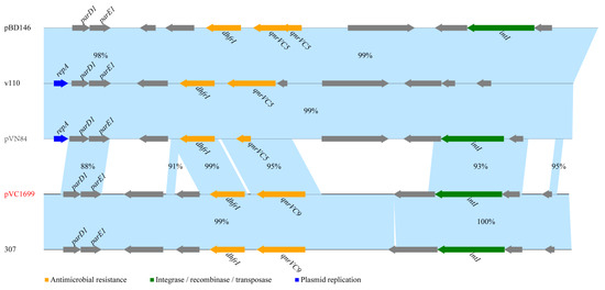 Among the eight strains containing qnrVC genes, we extracted a plasmid termed pVC1699 from VC1699, which was isolated from a patient in Jiangxi in 2006. Sequencing of pVC1699 determined that it was 7081-bp long with a GC content of 42.85%. The plasmid sequence was submitted to GenBank under the accession number OP821998. The ORF search revealed that pVC1699 carried qnrVC9 genes related to quinolone resistance. pVC1699 also carried genes for antitoxin (parD1), plasmid stabilization system protein (parE), integrase 1 (int1), and dihydrofolate reductase type 1 (dhfrI). BLAST revealed that pVC1699 had low identity with plasmids harbored qnrVC5, including pBD146 from V. fluvialis (GenBank accession no. EU574928.1), plasmids v110 from V. parahaemolyticus (GenBank accession no. KC540630.1), and pVN84 from V. cholerae O1 (GenBank accession no. AB200915.1) (Figure 2). However, pVC1699 had high identity to 99% with a plasmid termed 307 from V. vulnificus (GenBank accession no. MZ325519) (Figure 2).