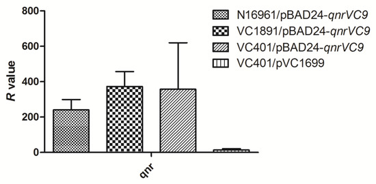 Comparisons of qnrVC gene expression in N16961/pBAD24-qnrVC9, VC1891/pBAD24-qnrVC9, VC401/pBAD24-qnrVC9, and VC401/pVC1699 cultured by Mueller–Hinton agar containing 0.1% (w/v) arabinose. The relative expression values (R) were measured by RT-PCR. All assays were performed in triplicate, and the means and standard deviations were shown.