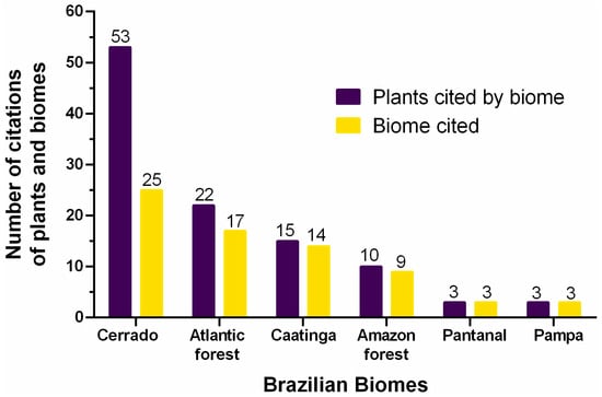 Pantanal (lowlands) has dry winters and rainy summers climate, and the predominant vegetation is floodplain [16]. It is the smallest Brazilian biome in terms of territory [16], but it is one of the largest wetlands in the world [22]. Anthropogenic changes that have taken place mainly in Amazon and Cerrado has been also affected the Pantanal, as soil erosion and difficult in water, food, and ecosystem service security [22]. However, subsistence practices and traditional medicine are common. Pessoa et al. [23] carried out a ethnobotanical study with 233 riverine people in the Pantanal regions and reported 32 botanical families with medicinal properties, mainly Fabaceae, Rutaceae, Amaranthaceae, and Solanaceae. The smaller number of articles found in this work on plants with antimicrobial activity emphasizes the need to expand studies and value small biomes.